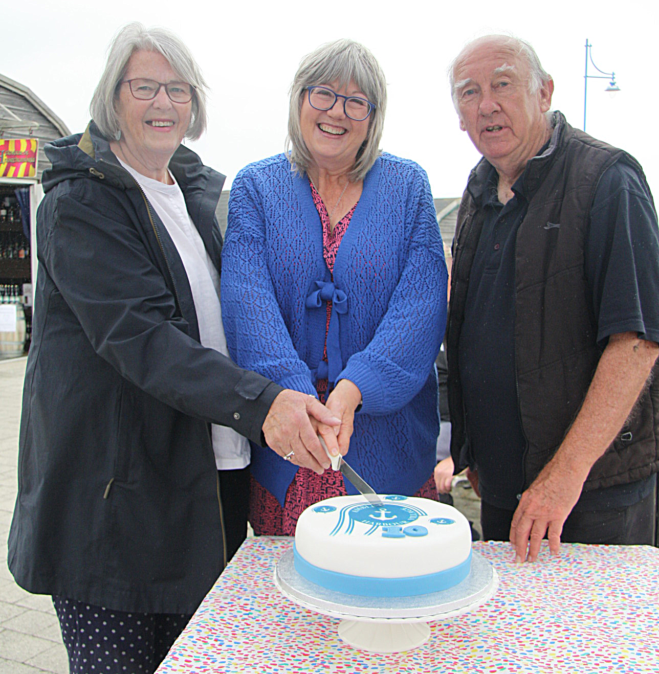 Ann Burke, Lynne Morelli and Bart Rippon cut the cake celebrating the 10th anniversary of the Harbour Village