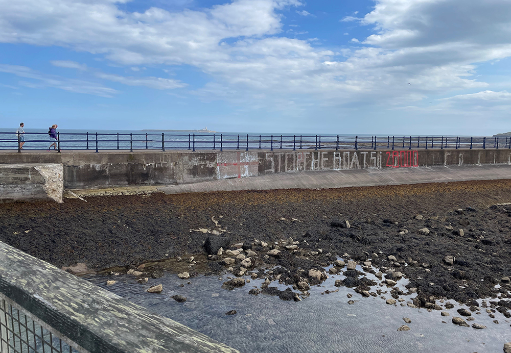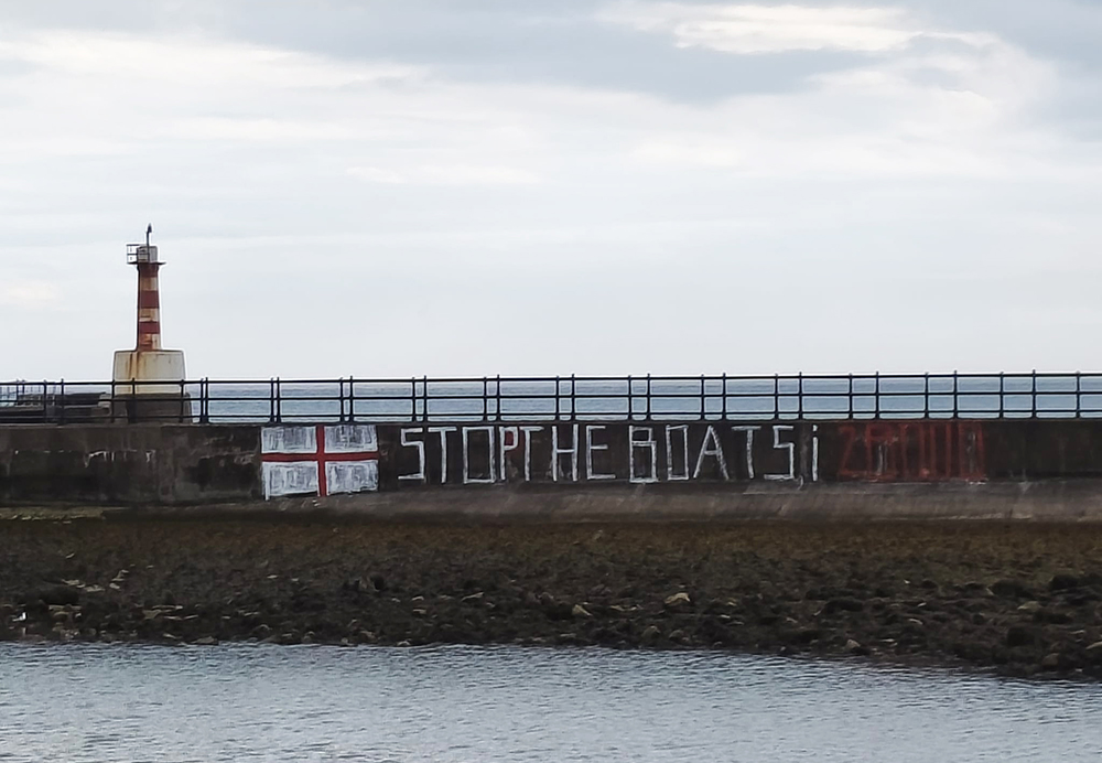 Vandals had painted a ‘stop the boats’ message in large letters on the sea wall, along with a St George’s flag and the number 28000.