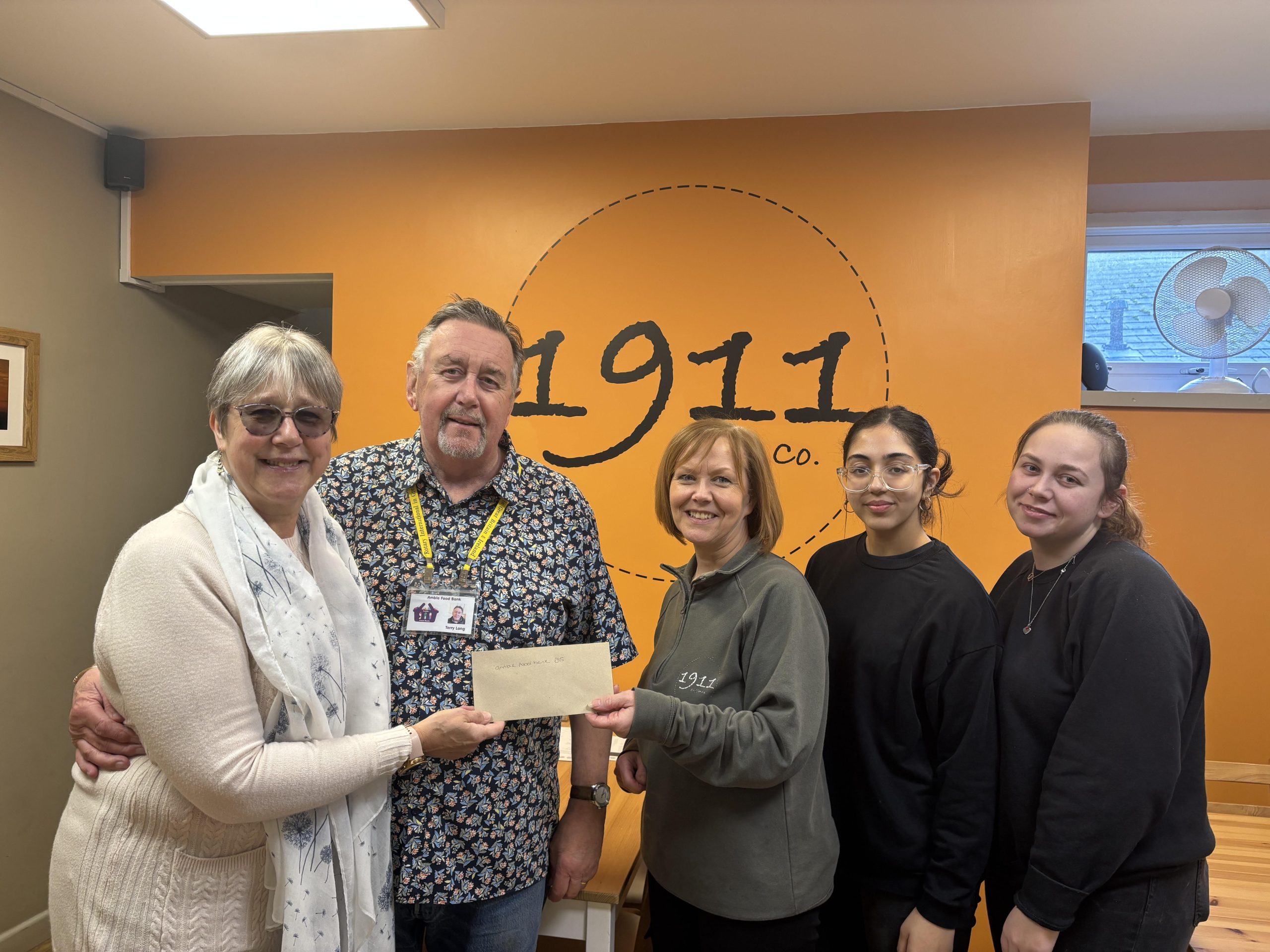 The photo shows Marion and Terry from Amble Food Bank accepting a £100 donation from 1911 staff, Angela, Ria and Shania.